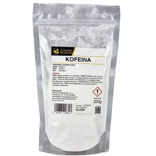 Kofeina (INCI: Caffeine) to naturalny alkaloid pozyskiwany z nasion kawy, liści herbaty oraz nasion guarany. W kosmetyce wykorzystywana jest głównie ze względu na swoje właściwości stymulujące i drenujące. Występuje w formie białego, drobnokrystalicznego proszku, rozpuszczalnego w wodzie i odpornego na działanie podwyższonej temperatury.